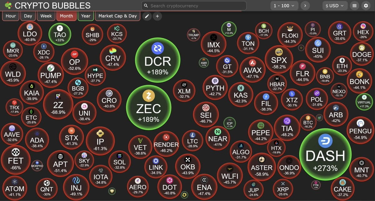 Historicamente, as moedas de privacidade aumentam de valor mais tarde nos ciclos de alta, quando os usuários rotacionam lucros em ativos com potencial assimétrico.