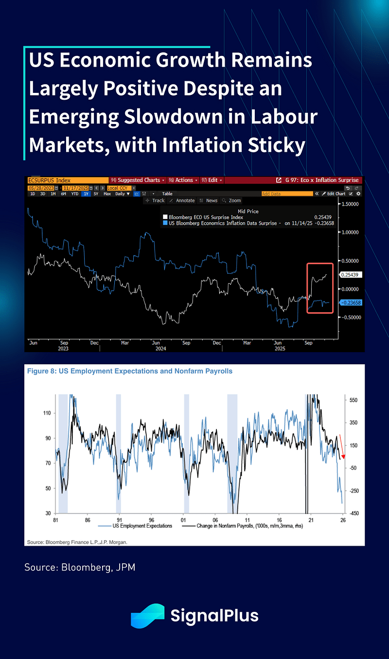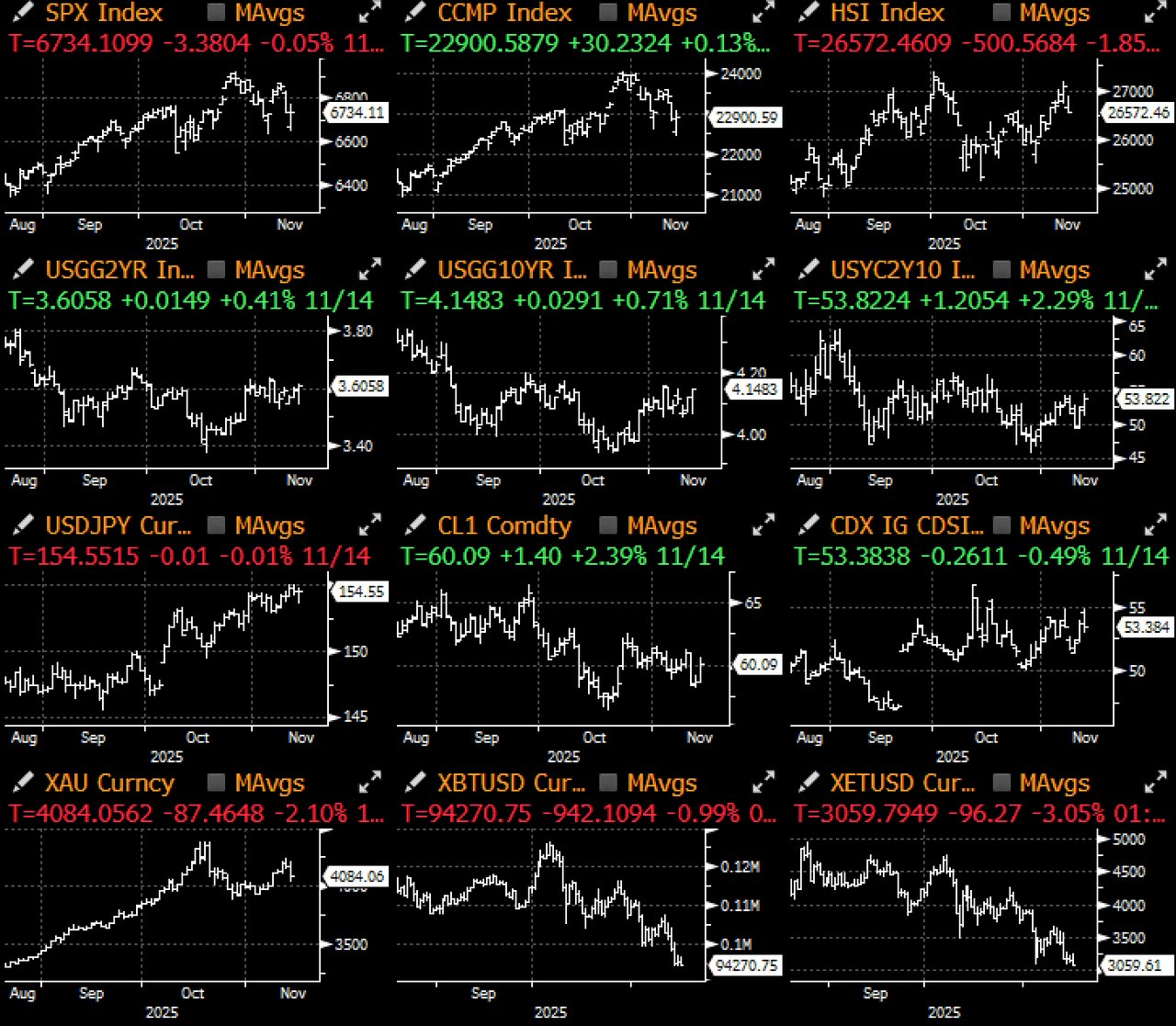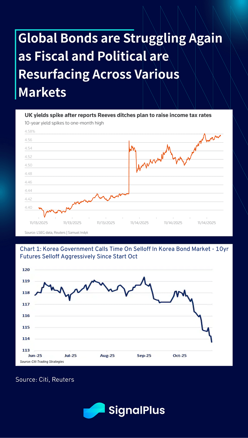 Nos EUA, as probabilidades de corte de taxa em dezembro caíram para 40% à medida que os funcionários do Fed têm saído em força para gerenciar as expectativas de afrouxamento, com a economia dos EUA ainda se mantendo em grande parte, apesar de algumas preocupações sobre o mercado de trabalho. A maior preocupação continua sendo com a inflação, onde o presidente Trump recentemente sofreu um revés significativo nas pesquisas devido à alta inflação e preocupações com o aumento do custo de vida, com a ex-secretária do Tesouro e presidente do Fed, Yellen, declarando que os EUA estão “em perigo de se tornar uma república das bananas”.