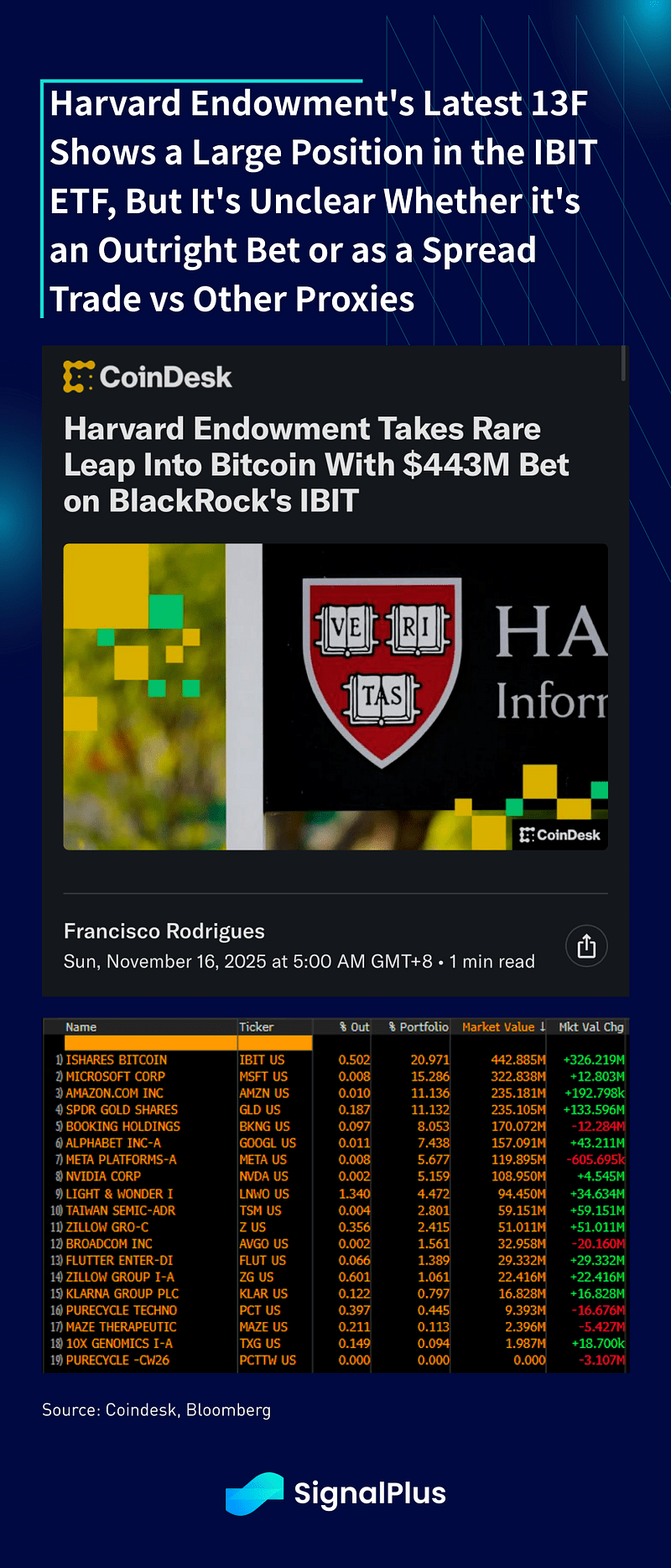 Em meio a todo o pessimismo, houve alguma boa notícia do espaço recentemente? Além do recente anúncio do Square de que eles começaram a aceitar pagamentos em Bitcoin para seus comerciantes, os últimos registros 13F também mostraram que o Endowment de Harvard (com $57B AUM) agora tem uma posição de $443M em IBIT, sua maior participação única no portfólio. Mas antes que todos fiquem muito animados, não está claro se a posição é uma longa pura ou como uma negociação de spread/arbitragem em relação a DATs ou outro proxy cripto. Tendemos a acreditar na última, mas ainda é bom ver que as contas de dinheiro real do TradFi estão pelo menos se tornando participantes mais ativas nesse espaço, mesmo que não seja apenas uma exposição longa pura.