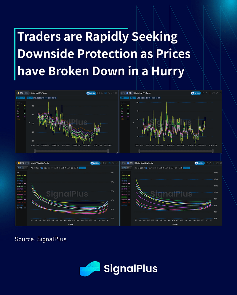 Após um longo período de estagnação, tanto a volatilidade realizada quanto a implícita aumentaram à medida que os preços colapsaram através dos intervalos do ciclo de alta. Em particular, os skews de venda continuam a ser comprados, especialmente para ETH, onde o suporte de dinheiro real é menos favorável do que o BTC, levantando preocupações sobre quedas mais acentuadas.