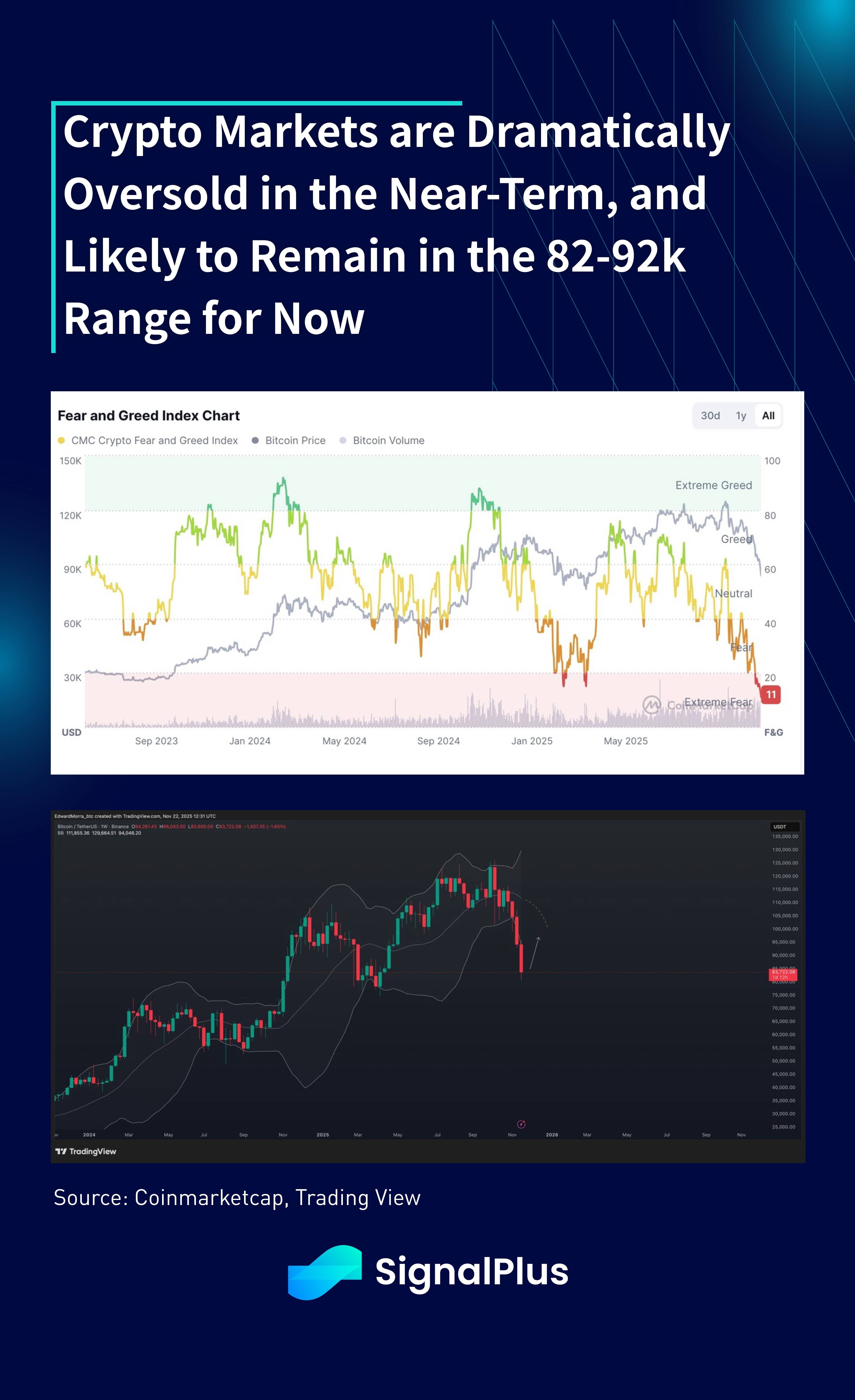 Dito isso, os mercados estão atualmente tão sobrevendidos tanto do ponto de vista do sentimento quanto do técnico (por exemplo, bandas de Bollinger), e os preços provavelmente viram mínimas locais por enquanto, na ausência de novos fatores exógenos (por exemplo, vendas forçadas de DAT), e esperamos que os preços variem entre 82–92k a partir daqui. O próximo suporte significativo de preço vem em torno da área de 78k, e uma quebra sustentada abaixo abriria espaço para uma queda significativa adicional, mas não é o cenário base por enquanto.