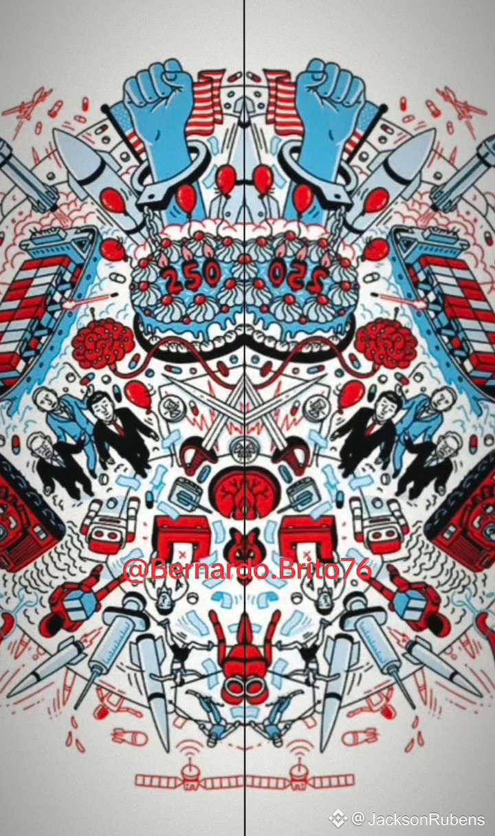 Implosão Política/Econômica: O bolo de 250 anos cheio de mísseis, cérebros e elites em conflito representa a falência moral e fiscal do sistema capitalista/militarista. O vermelho nos gráficos simboliza a crise financeira.