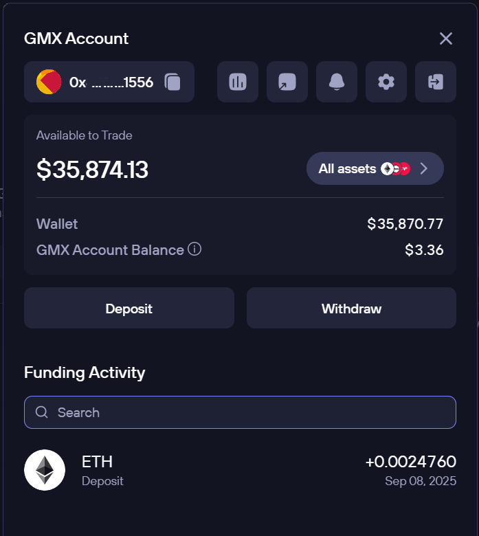 🔹 Use fundos de sua carteira de autocustódia e conta GMX