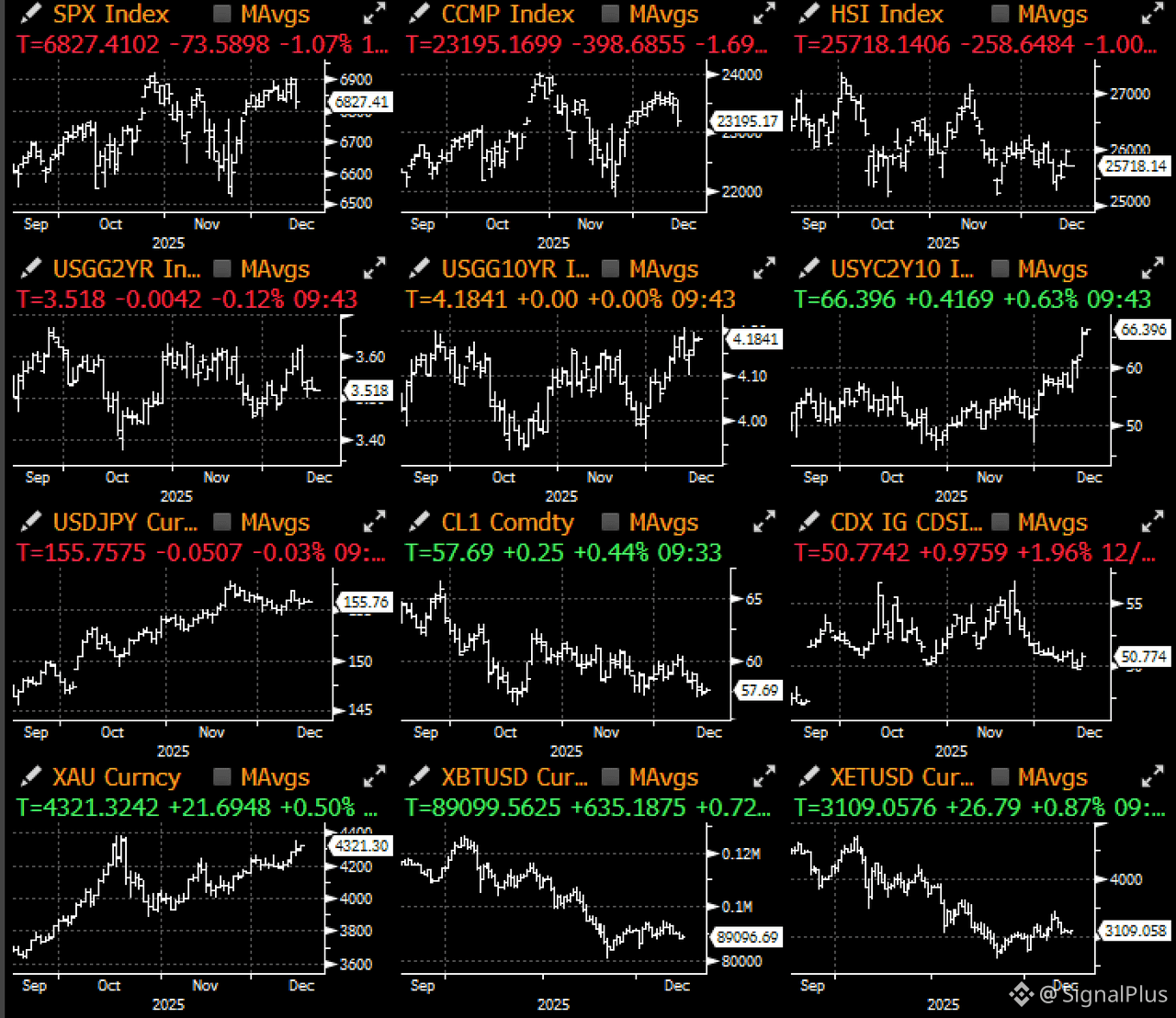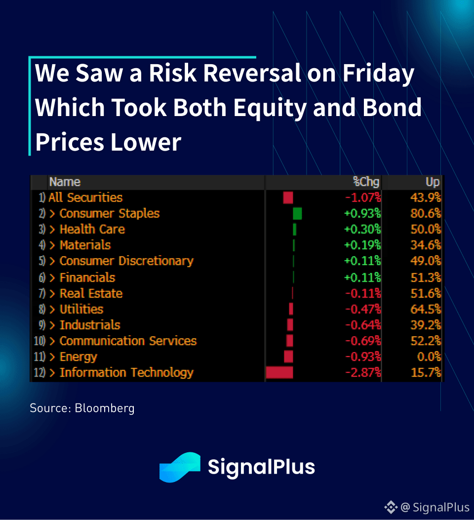 Risk sentiment made a 180 degree turn on Friday as macro assets sold off across the board, led by significant weakness in tech stocks with a bear steepening in the yield curve. Concerns over Oracle and Broadcom earnings dragged overall risk complex lower, while year-end profit-taking and sector rotation dragged Nasdaq lower by -2% intraday at one point.