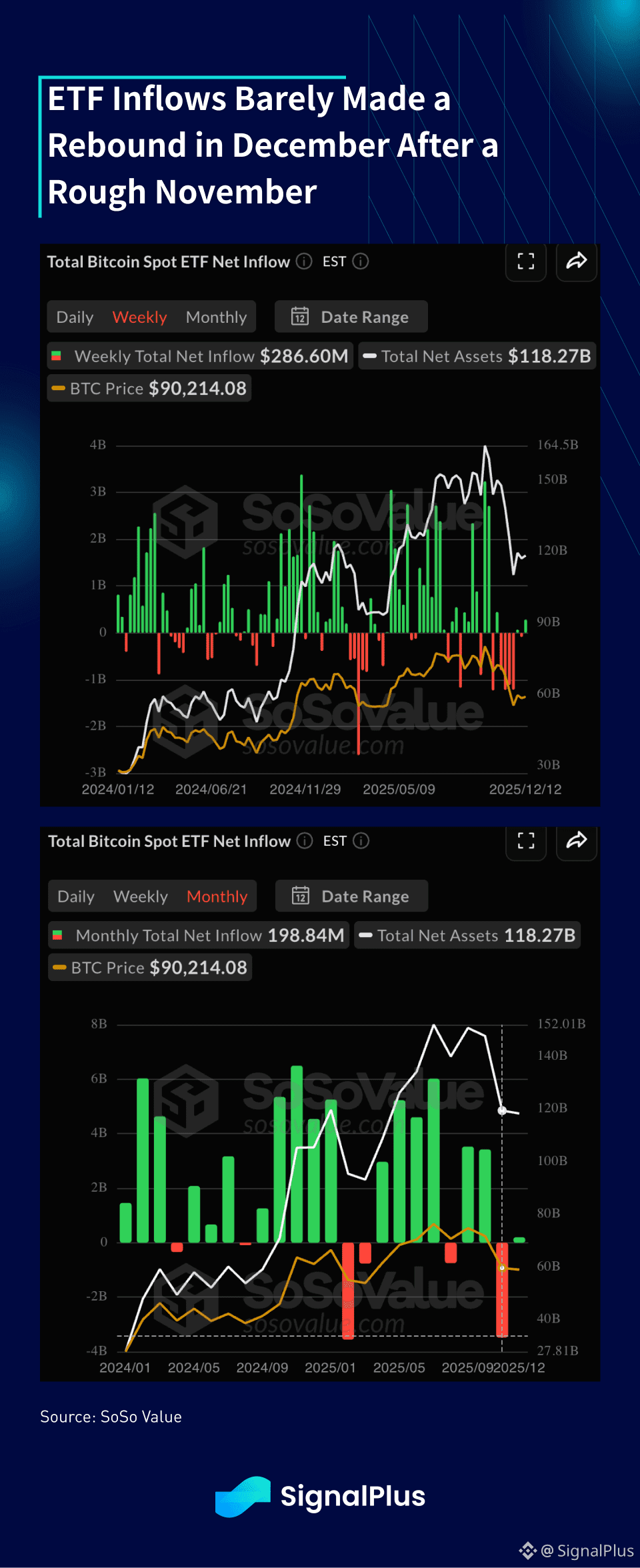 With global markets about to enter holiday mode, the 24/7 nature of crypto could be a detriment heading into year-end, with price movements likely to be exacerbated, particularly on further risk-offs and de-risking moves. ETF inflows made a tiny rebound last week following weeks of outflow, with December MTD numbers coming in at +0.2B vs -3.5B last month.