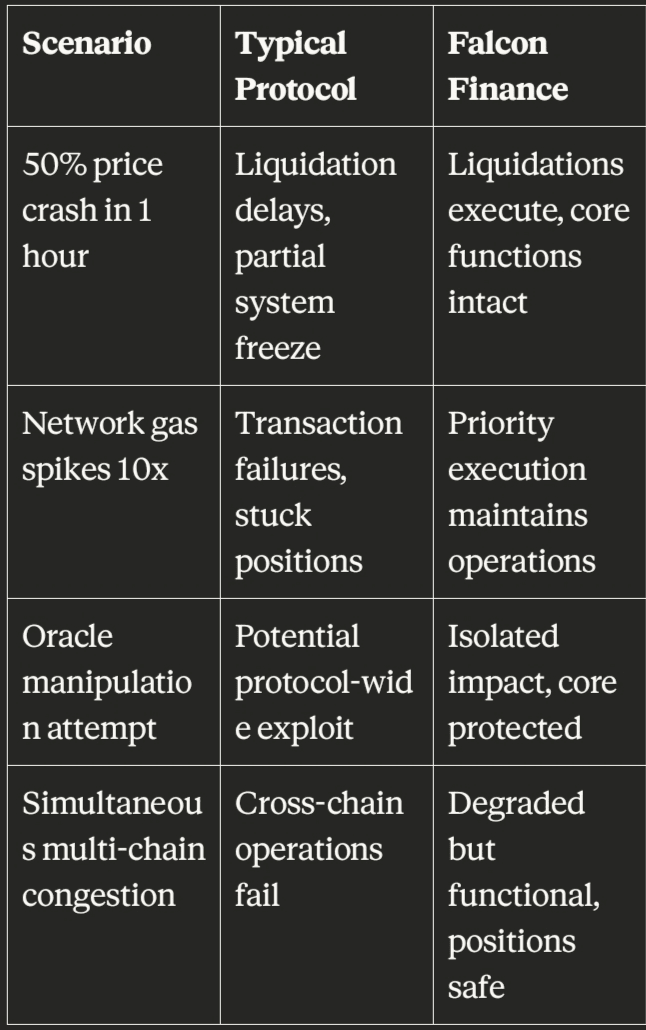 Quando analiso protocolos, olho para o que acontece quando as coisas dão errado. A maioria dos protocolos otimiza para os 99% do tempo em que os mercados estão calmos. A Falcon é projetada para o 1% quando tudo quebra.