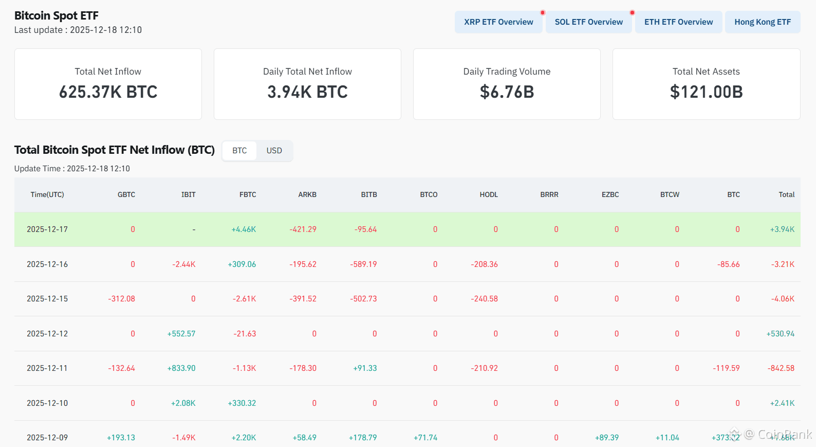 Since the launch of Bitcoin ETFs, one of the most visible changes has been the transformation of market capital structure. According to official CoinGlass data, as of December 18, 2025, total net assets of U.S. spot Bitcoin ETFs had reached approximately USD 121 billion. Meanwhile, ETF flows have shown net inflows across multiple recent trading days, indicating sustained demand for regulated Bitcoin investment vehicles.