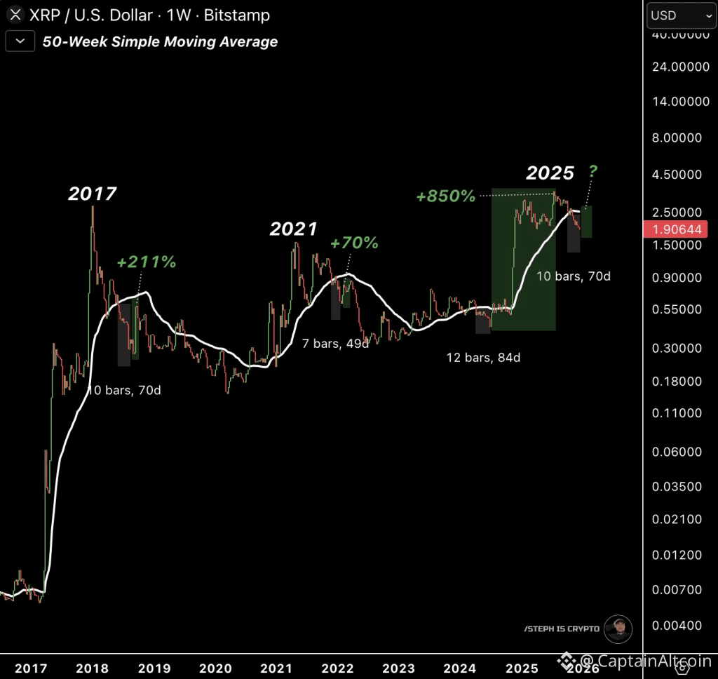 Steph Is Crypto highlighted a repeating pattern tied to the 50-week SMA that shows up across multiple XRP cycles. Each time XRP breaks below this moving average and remains there for a specific window, the market eventually shifts from contraction to expansion.