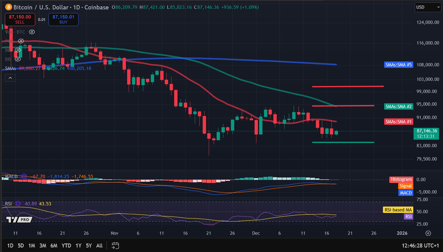 O Bitcoin (BTC) está sendo negociado em torno de $87.000, pois continua sob pressão, com analistas alertando para uma desaceleração mais profunda no início de 2026. A criptomoeda insignia se recuperou na quarta-feira, cruzando brevemente a marca de $90.000. No entanto, a recuperação perdeu momentum à medida que a pressão de venda em níveis mais altos forçou o preço para baixo. O Bitcoin continua a ter um desempenho inferior em comparação com os mercados de ações, à medida que os traders se posicionam para mais queda em torno do vencimento das opções de 26 de dezembro.