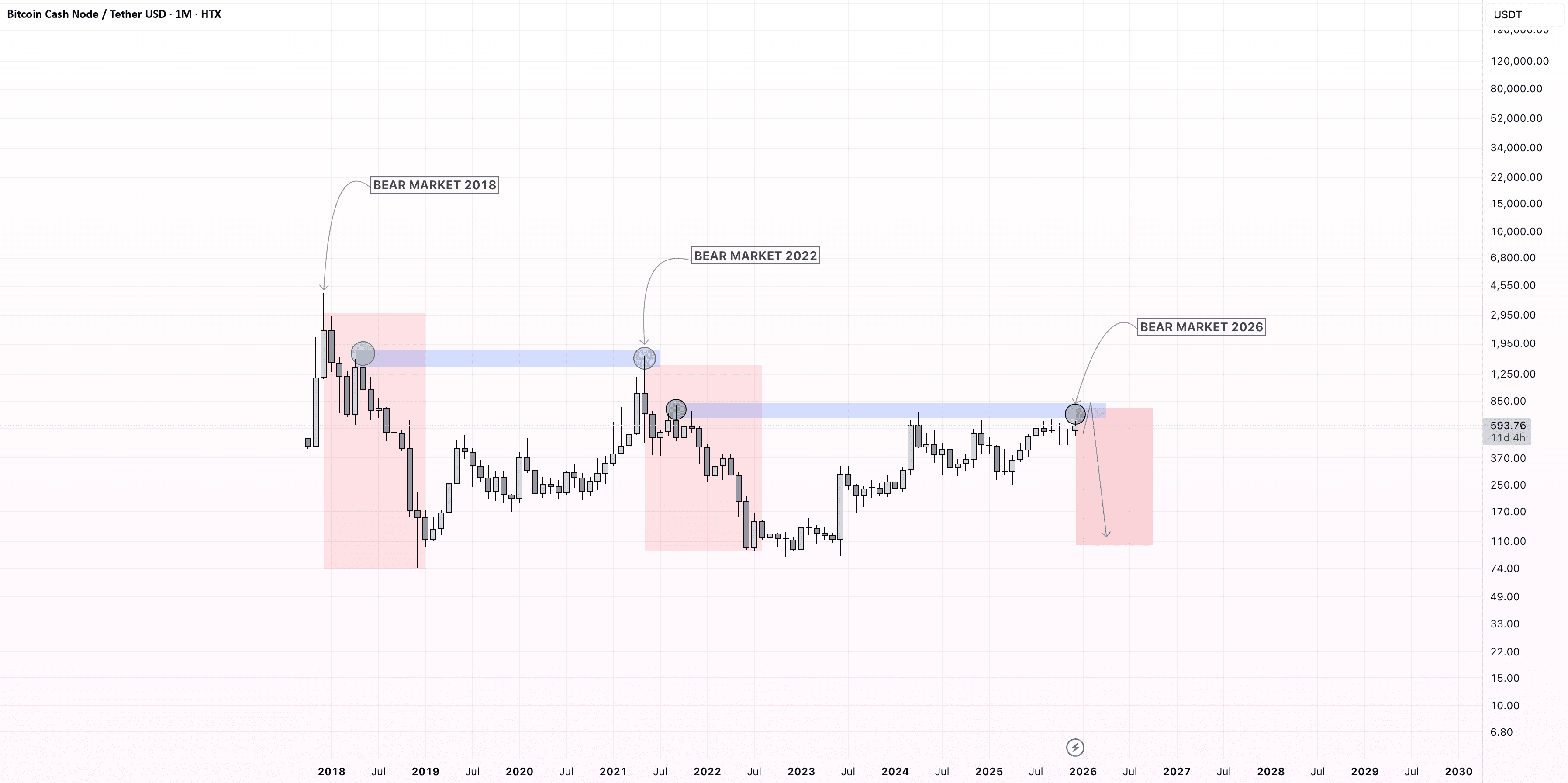 Com base na estrutura histórica de preços, o Bitcoin Cash (BCH) parece estar se aproximando de uma zona de resistência macro em torno de $700–$800, que anteriormente marcou o último aumento antes de grandes mercados em baixa.