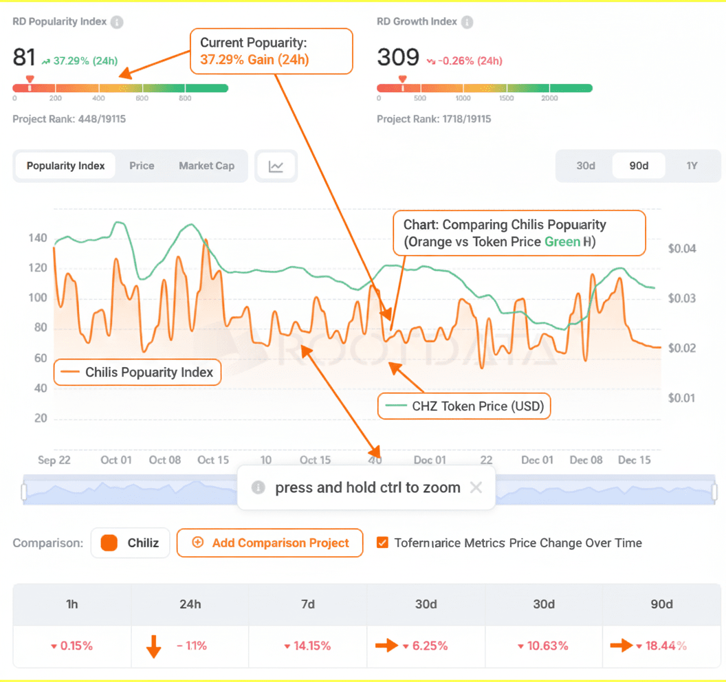 Capitalização de Mercado: A capitalização de mercado aumentou para aproximadamente $384 milhões, classificando a CHZ em torno do #176 globalmente.