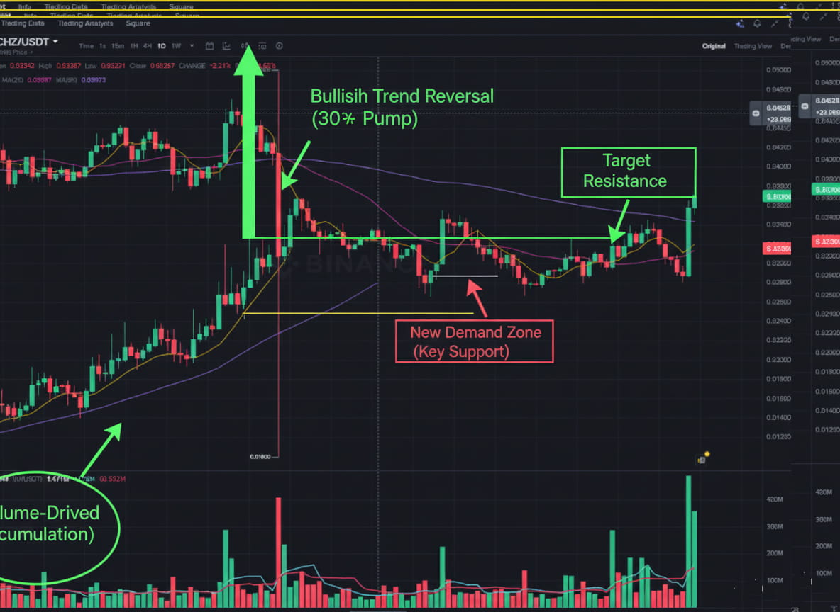 Resistência: A CHZ está testando resistência imediata em torno de $0.038–$0.040. Um rompimento limpo acima desta zona pode ver um rali em direção a $0.044–$0.050.