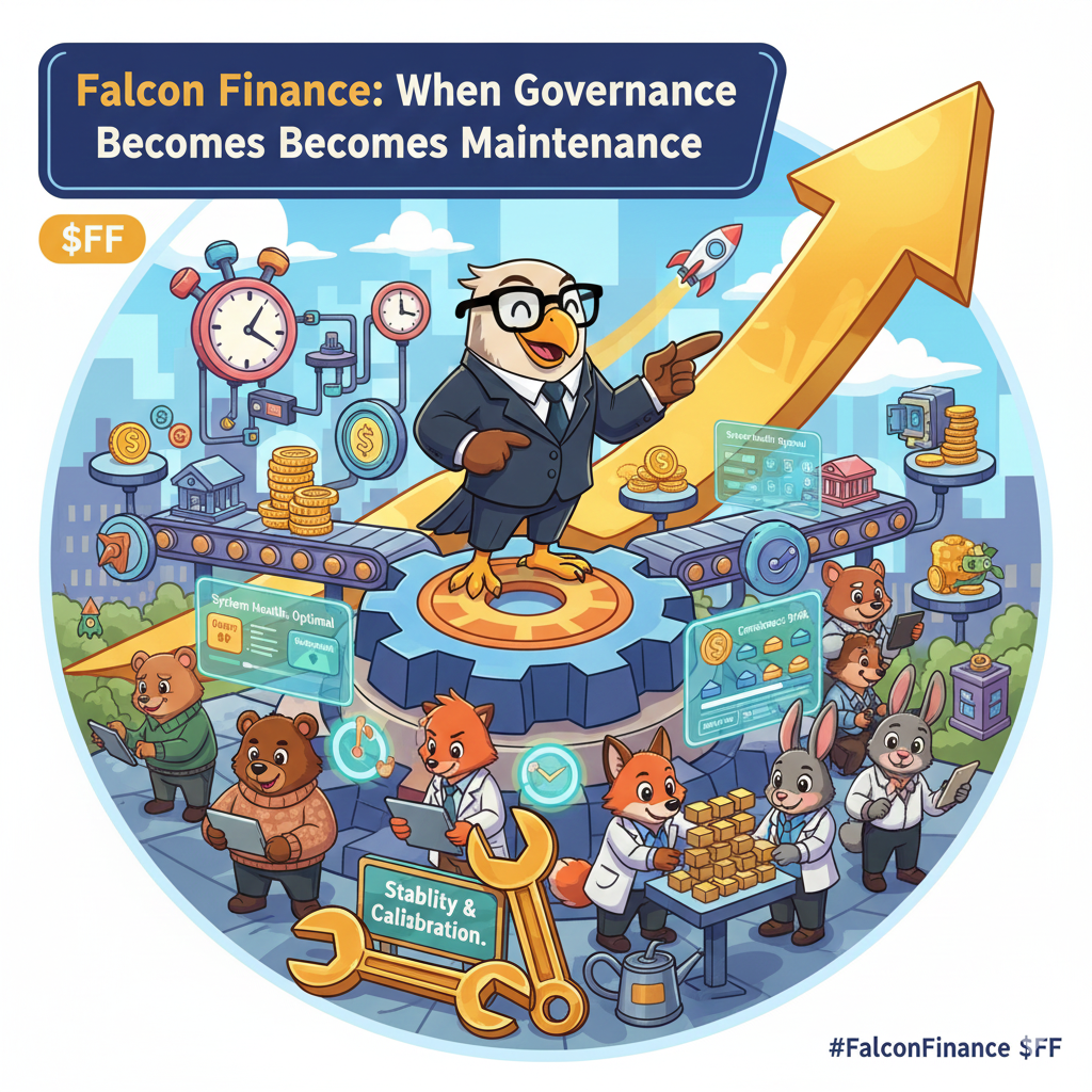 Governança como administração silenciosa, não um debate ardente. Imagine um protocolo que superou a frenesi de startups, descartando o caos de constantes pivôs pelo zumbido constante de uma máquina bem lubrificada. Não há mais votos semanais sobre integrações de ativos selvagens ou apostas em parâmetros atualmente, a governança do Falcon zune com o ritmo de verificações rotineiras, como um piloto escaneando instrumentos em pleno voo em vez de reescrever o plano de voo.