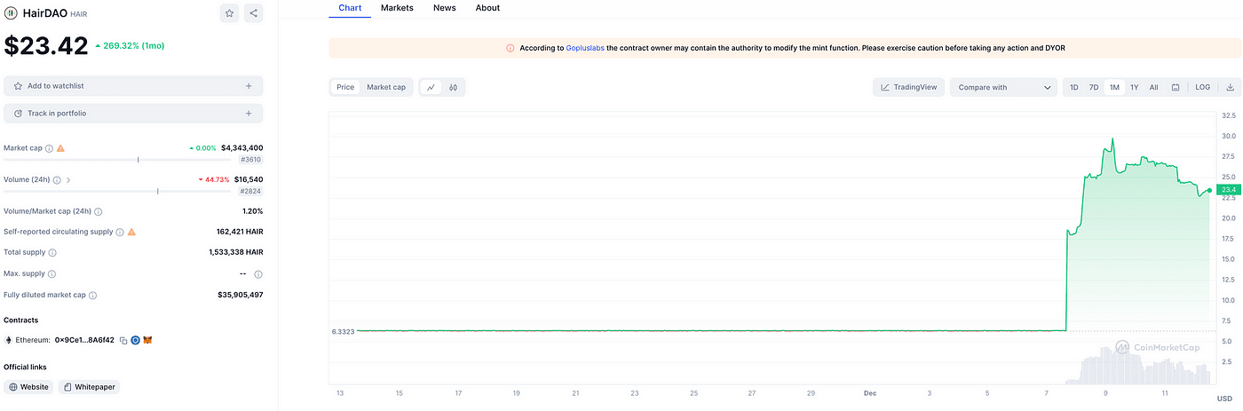 Qualidade Meme: No campo DeSci, HairDAO se destaca pelo tema “queda de cabelo” e imagem alegre e bem-humorada. Seu Twitter ainda usa símbolos emoji de barbearia, aprimorando as características de sua moeda meme.