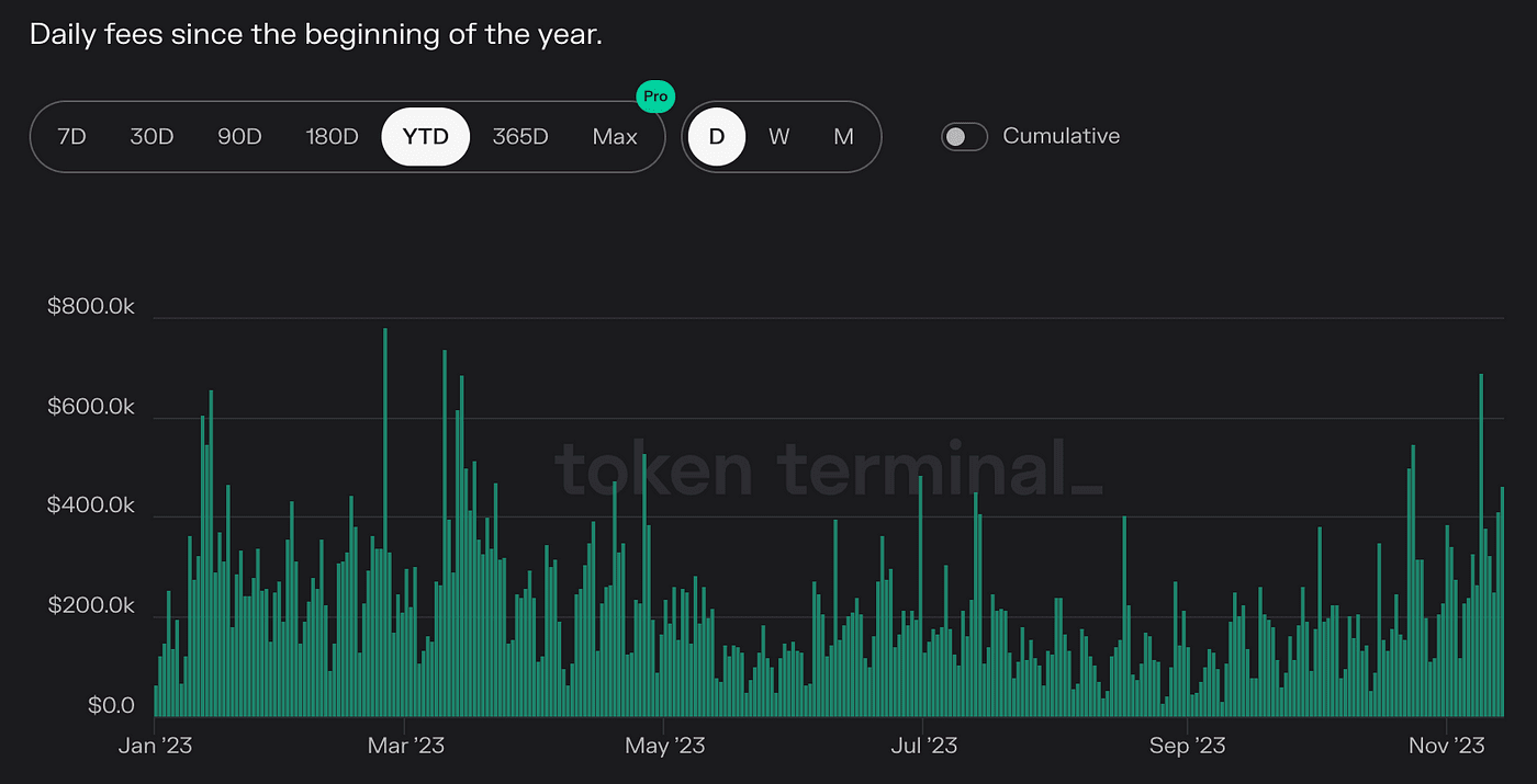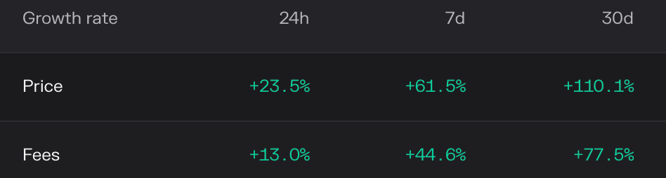 Em resumo, acreditamos que, com a conclusão da migração da cadeia de aplicativos do dYdX e o impacto de seu modelo de tokenomics atualizado, os fundamentos do dYdX mostram uma tendência de crescimento constante e de melhoria, e o token DYDX também capturará ainda mais o crescimento do valor do dYdX. Ao mesmo tempo, desde 25 de outubro, o sentimento geral do mercado criptográfico aqueceu, com volatilidade e liquidez significativamente aumentadas. O aumento significativo no preço do token DYDX também reflete as expectativas otimistas do mercado de que o sentimento de alta do mercado possa continuar, o volume de negociação da plataforma continuará se expandindo e as receitas de taxas sustentarão o crescimento.