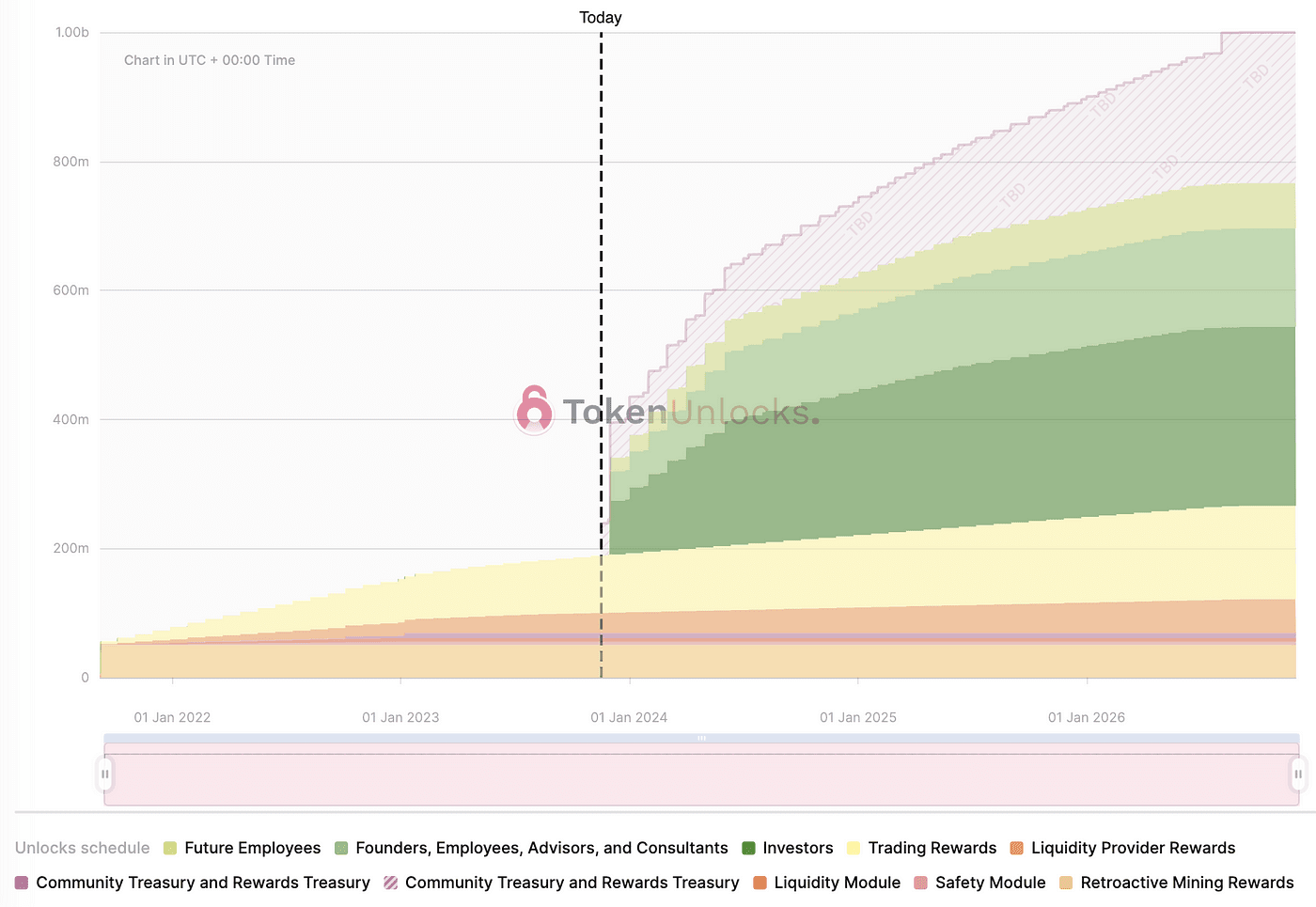 Em dezembro veremos um desbloqueio substancial de tokens, mas prevemos que isso não resultará em uma venda significativa de tokens. As equipes e os primeiros investidores podem optar por capturar o potencial de crescimento do dYdX apostando tokens.