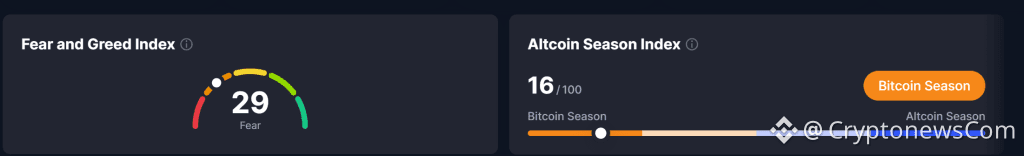 Market psychology remains guarded. The Fear and Greed Index sits at 29, firmly in fear territory, reflecting cautious positioning rather than optimism. Meanwhile, the Altcoin Season Index at 16/100 confirms capital concentration in Bitcoin, with little appetite for broad risk rotation.