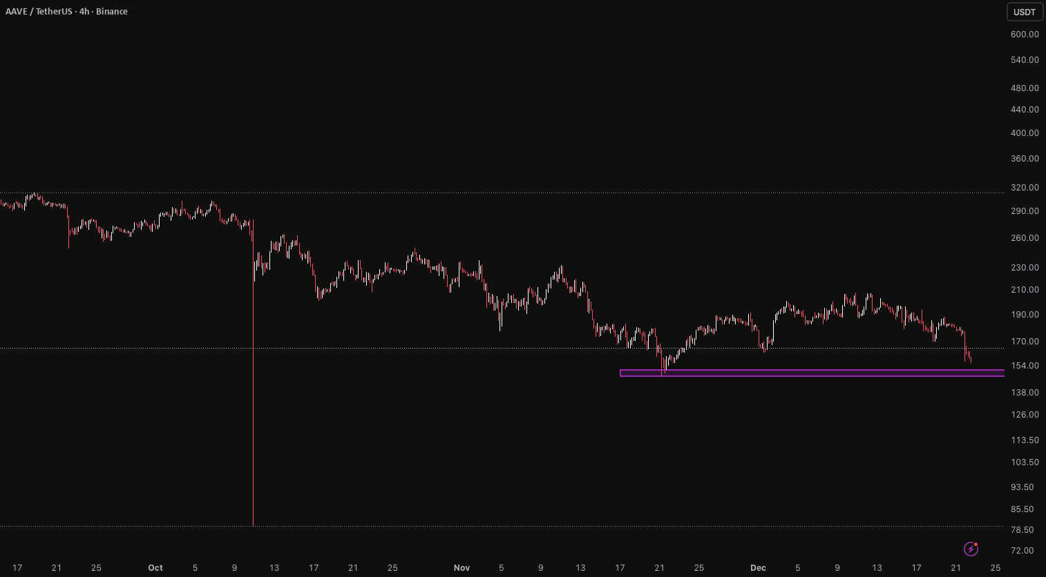 AAVE continua a negociar dentro de uma estrutura corretiva prolongada e agora está diretamente em uma zona de demanda bem definida em um período de tempo mais alto. Esta área anteriormente atuou como uma base forte, desencadeando reações significativas após uma pressão prolongada para baixo. O movimento atual para esta zona parece ser impulsionado pela liquidez em vez de vendas impulsivas.