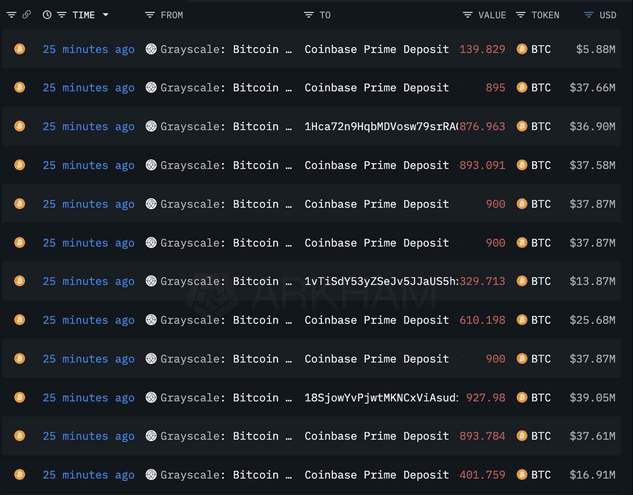 Grayscale depositou 6.534 BTC (US$ 274,95 milhões) na CoinbasePrime novamente há 30 minutos.