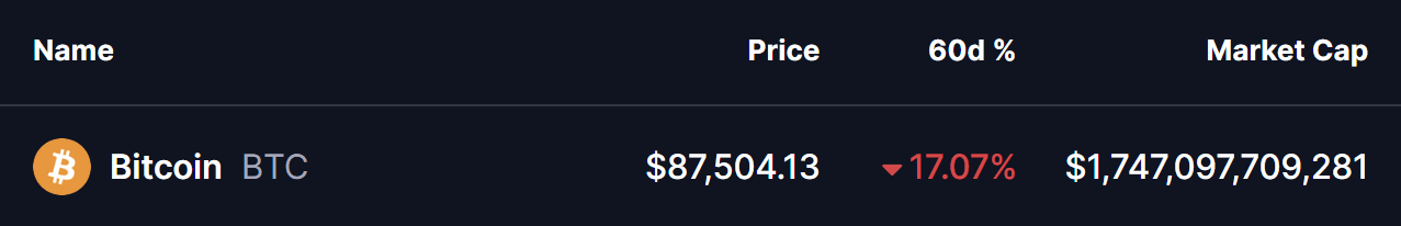 O Bitcoin (BTC) passou pelas últimas semanas passando por uma fase corretiva e em grande parte lateral após sua forte queda de máximas históricas perto de $126.000. A correção empurrou $BTC para a região de $87.000, esfriando o momentum com uma queda de 17% em 60 dias e mantendo os traders cautelosos à medida que 2025 se aproxima de seus dias finais.
