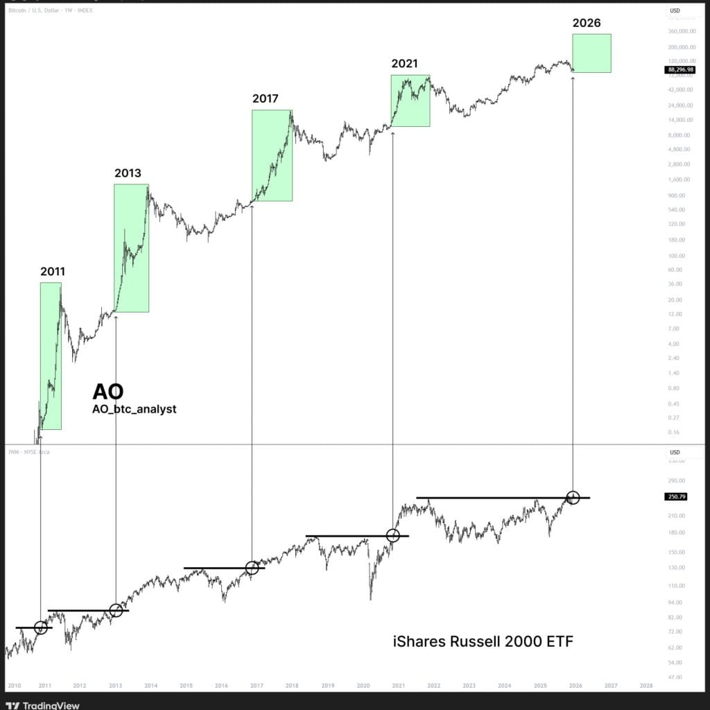 Um gráfico comparativo de longo prazo compartilhado pelo analista de criptomoedas @AO_btc_analyst destaca um padrão recorrente entre o Bitcoin e o Índice Russell 2000. Cada vez que o Russell 2000 conseguiu quebrar com sucesso acima de um nível de resistência horizontal importante, o Bitcoin passou a entregar uma expansão altista sustentada nos meses que se seguiram.