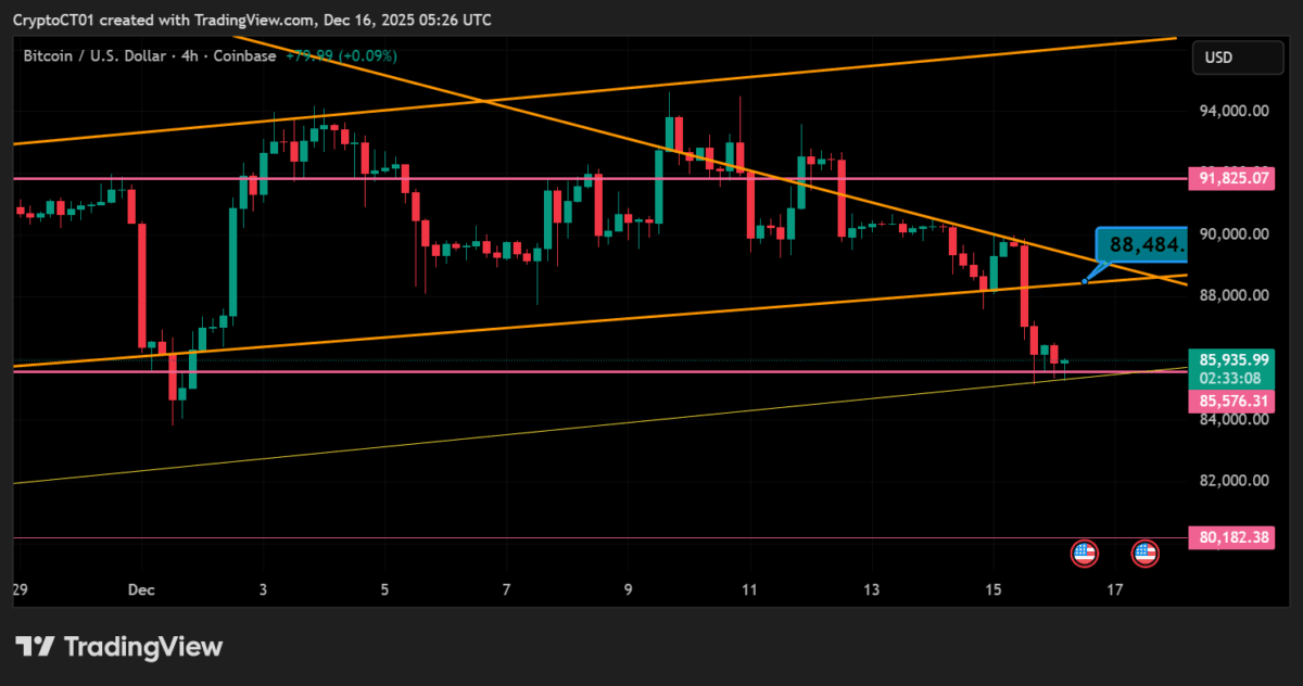 O Bitcoin (BTC) acaba de experimentar o maior colapso hoje, caindo para a faixa de $85.000 devido à incapacidade de sustentar a ruptura acima da linha de tendência de resistência significativa em $90.000. A queda acentuada foi acompanhada por velas de 4 horas agressivamente baixistas, indicando que as ordens de compra alavancadas estavam rapidamente se desfazendo devido à pressão esmagadora dos vendedores.