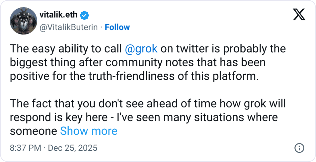 Ainda assim, Buterin disse que Grok tem sido mais bem-sucedido em tornar o X mais buscador da verdade do que muitos dos outros “lixos de terceiros que vemos.”