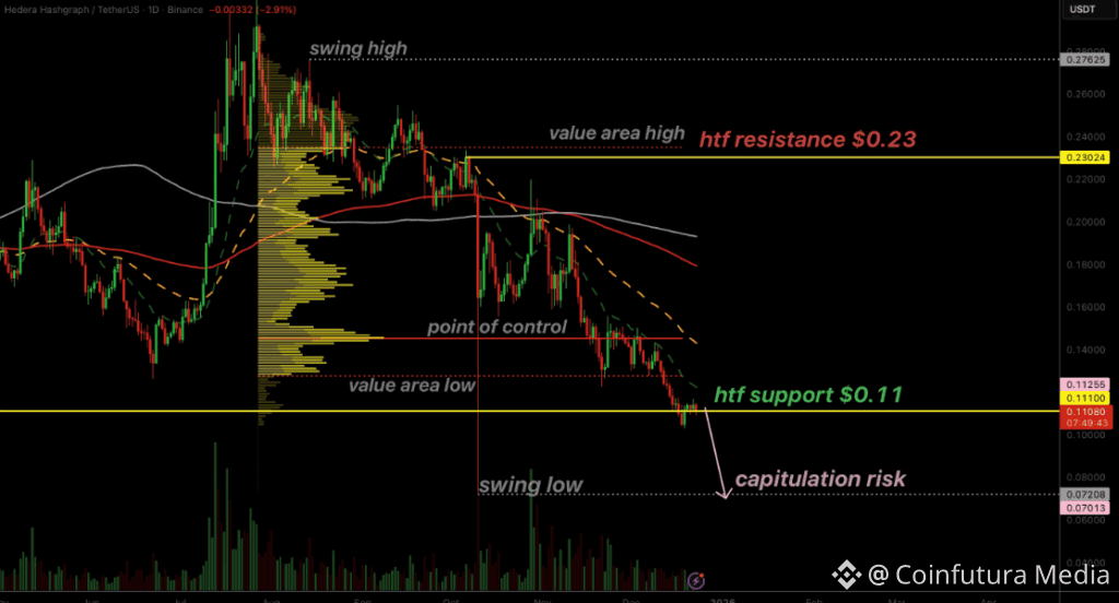 The post HBAR Faces Breakdown Risk as $0.11 Support Shows Signs of Weakness appears on Coin Futura. Visit our website to read more interesting articles about cryptocurrency, blockchain technology, and digital assets.