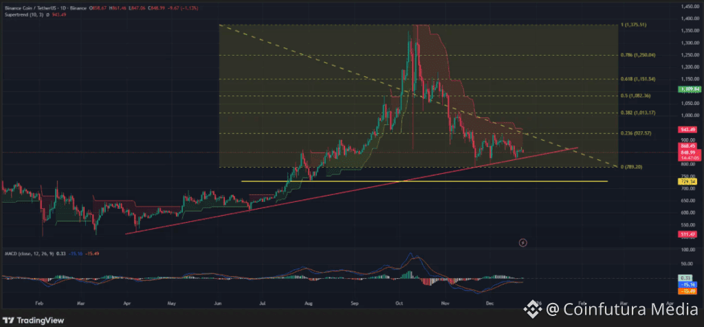 Technical indicators confirm a weakening trend. The MACD lines have fallen below the zero mark, signaling reduced momentum. Simultaneously, BNB has dropped beneath the Supertrend indicator, which has turned red—indicating that the bearish structure remains intact.