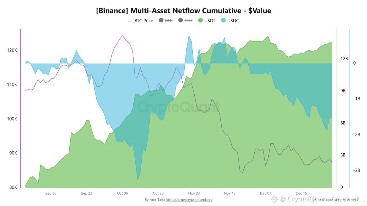This chart shows the cumulative netflow of multiple assets on Binance, mainly USDT and USDC.