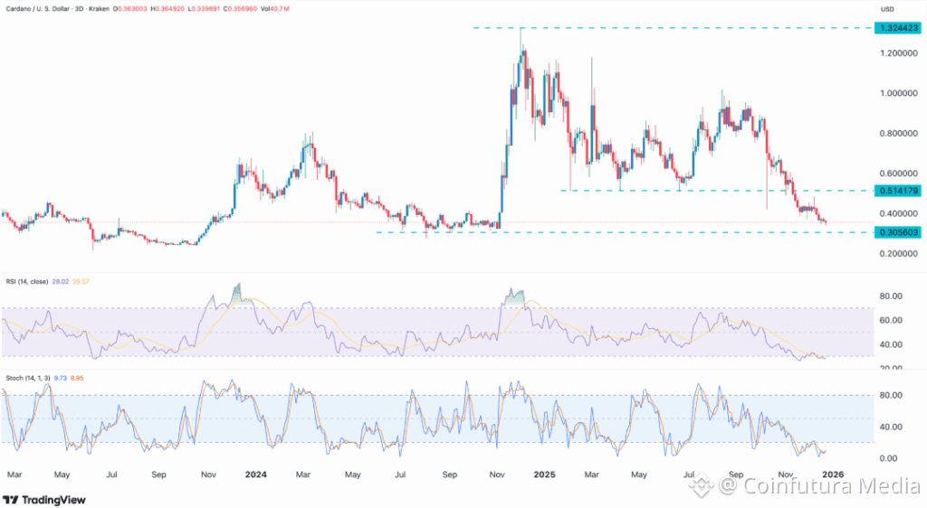 Cardano trades 73% below its December peak and approaches key support near $0.3056, raising prospects of a technical rebound.
