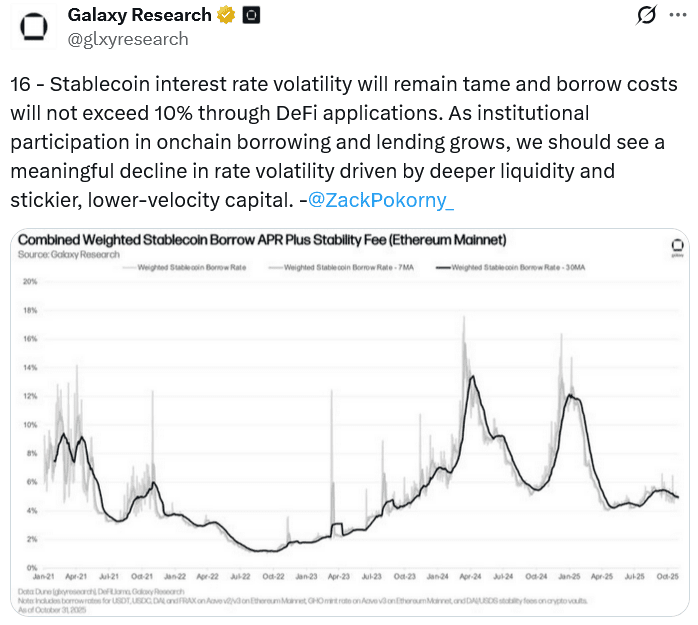 No início deste mês, a empresa de investimento em cripto Galaxy Digital previu que pelo menos um banco da Fortune 500, provedor de nuvem ou plataforma de eCommerce lançaria uma blockchain de camada 1 que liquida mais de $1 bilhão de atividade econômica real em 2026 e construiria uma ponte para o acesso a finanças descentralizadas.