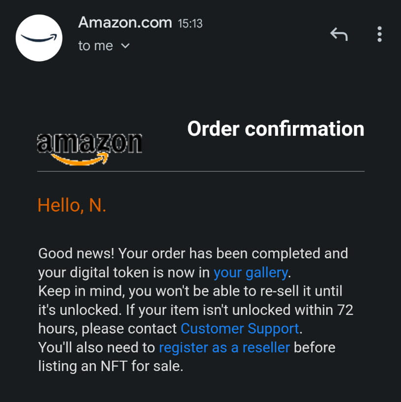 De acordo com o e-mail enviado a De, um token digital foi depositado em uma galeria hospedada no site oficial da Amazon. No entanto, parece que o link fornecido no e-mail ainda não funciona.