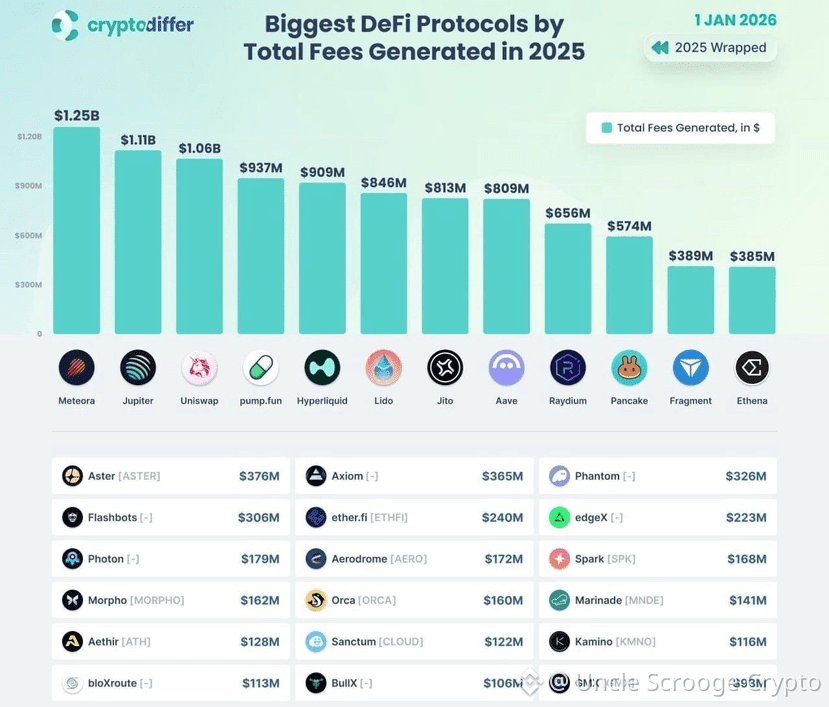 O ponto de virada mais visível nesta análise é, sem dúvida, o domínio do ecossistema Solana. Por muito tempo, o Ethereum foi o rei absoluto das taxas, com o Uniswap sendo a peça central de quase toda a atividade econômica on-chain. No entanto, o fechamento de 2025 revela que a praticidade venceu a tradição. O Meteora, liderando o ranking com $1,25 bilhão em taxas, e o Jupiter, logo atrás com $1,11 bilhão, mostram que o capital migrou para onde a fricção é menor. Na Solana, as transações custam frações de centavos e são quase instantâneas, o que permitiu que o varejo — o investidor comum — participasse ativamente do mercado sem ser devorado por taxas de gás abusivas.