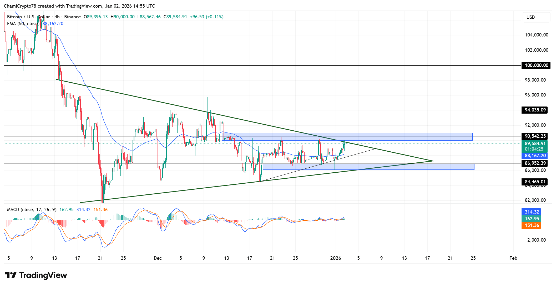 A recuperação da zona de demanda de 86k trouxe de volta a participação dos compradores e, como resultado, o preço se mantém acima da média móvel exponencial de 50. Essa compressão gradualmente canaliza o preço do Bitcoin em direção à resistência de $90,855, onde a oferta anterior repetidamente limitou os avanços.