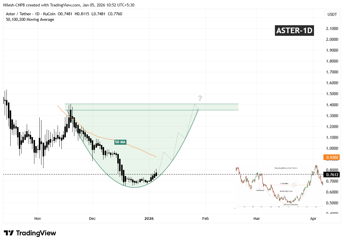 No gráfico diário, o Aster parece estar formando um padrão de fundo arredondado, uma estrutura clássica de inversão alcista que normalmente se desenvolve após uma fase corretiva prolongada. Esse padrão reflete uma transição gradual de vendas agressivas para uma acumulação constante, à medida que o impulso descendente desaparece e os compradores lentamente recuperam confiança.