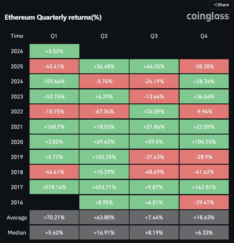 Toda vez$ETH teve tido um Q4 vermelho, o Q1 seguinte é sempre verde
