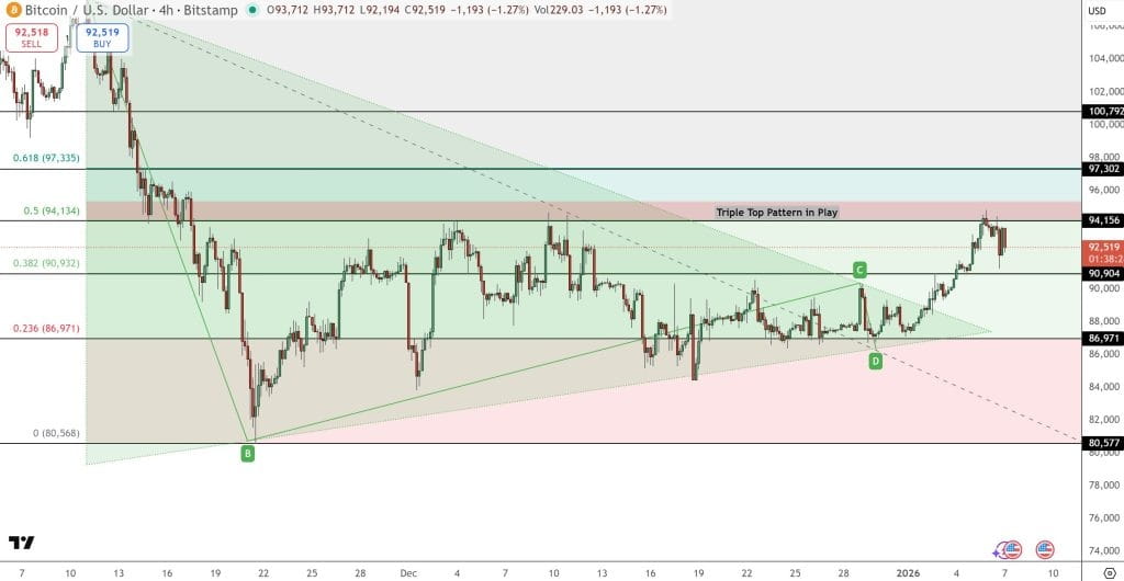 No gráfico de 4 horas, a previsão de preço do Bitcoin permanece alcista, pois o BTC continua limitado abaixo da faixa de resistência de 94.000–95.000 dólares, onde uma estrutura de triplo topo começou a se formar.