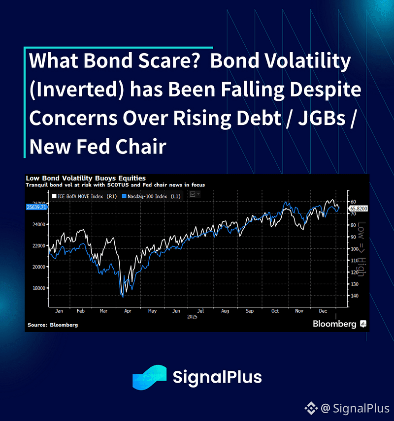 Finally, falling volatility and correlation is another tell. Implied correlation continues to fall as stock breadth improves, while low macro volatility is helping to usher equity prices higher. Despite the usual doomsday talk on rising outstanding debt and JGB yields, fixed income implied vols closed 2025 at the lowest level in years.