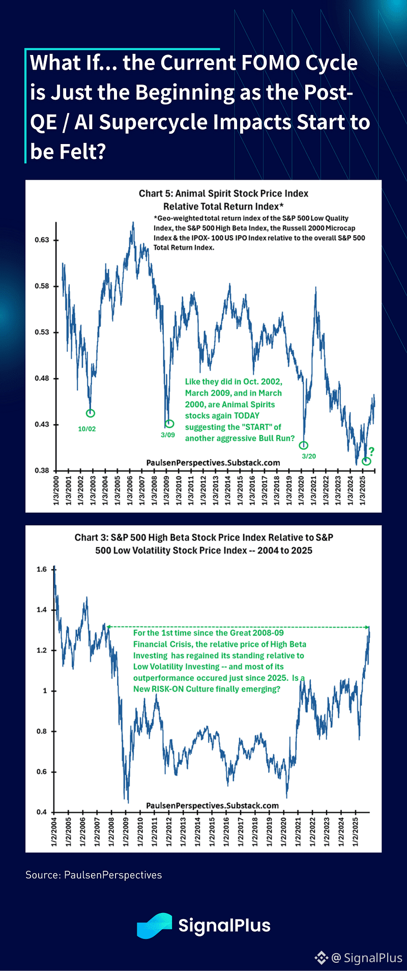 Third, we might be seeing notable changes in animal spirits, where the recent strengths in high beta, low quality, small cap, and IPO names have really started to regain leadership and outperformance. Ultra-long term charts suggest that we might be seeing a structural break higher on FOMO / animal spirits — is this one of the realized outcomes of a prolonged AI-supercycle and merchantlist superpowers?