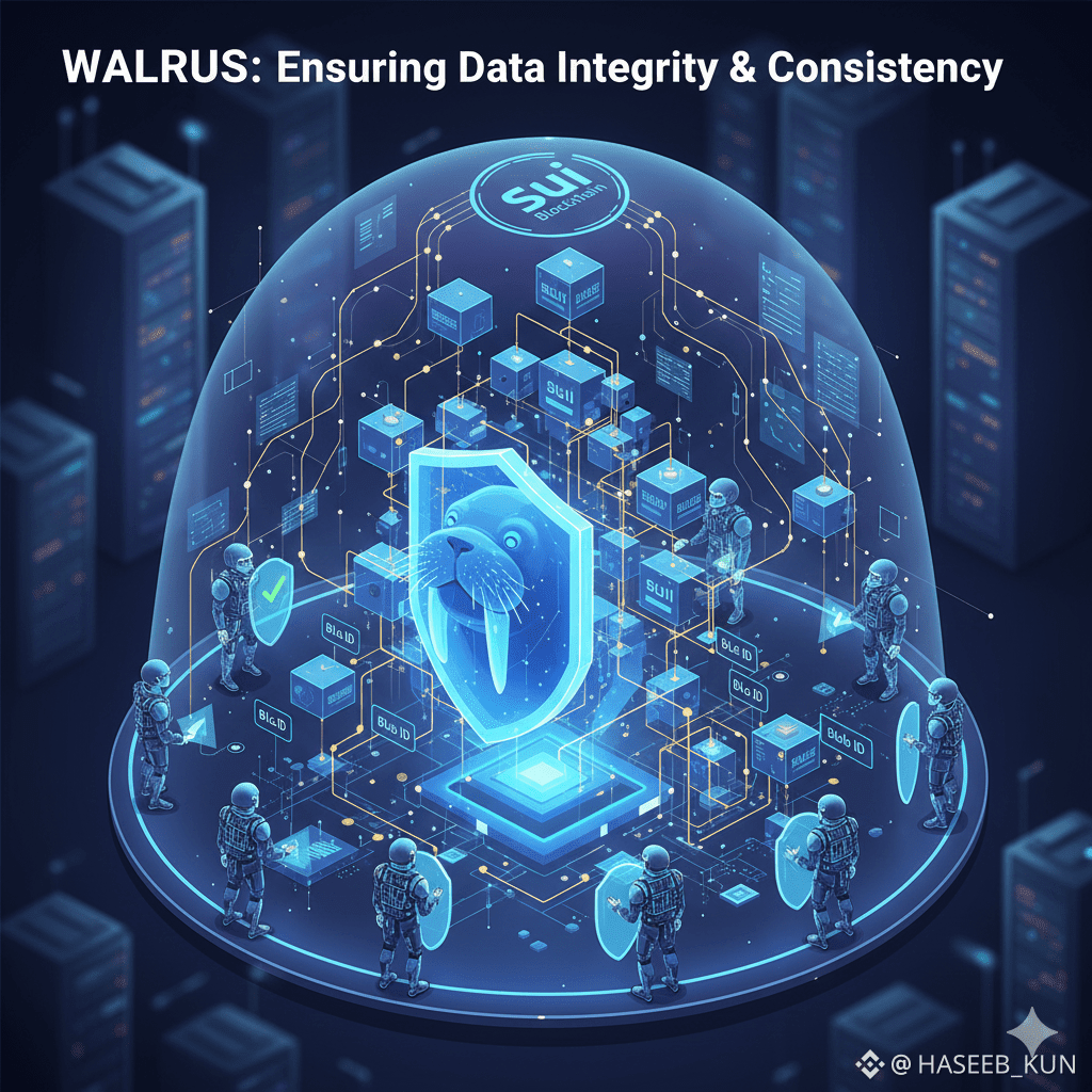 In conclusion, ensuring data integrity and consistency in decentralized storage requires a multi-layered, holistic approach, and Walrus delivers this with precision and elegance. By embedding cryptographic identification, scalable verification, space-efficient redundancy, configurable consistency, and economic accountability into every aspect of its architecture, Walrus guarantees that data remains authentic, available, and recoverable—even in adversarial or dynamic environments. For AI applications, blockchain rollups, NFT platforms, and other decentralized ecosystems, Walrus transforms storage from a potential vulnerability into a strategic, verifiable, and governable asset, setting a new standard for trust in the decentralized era.