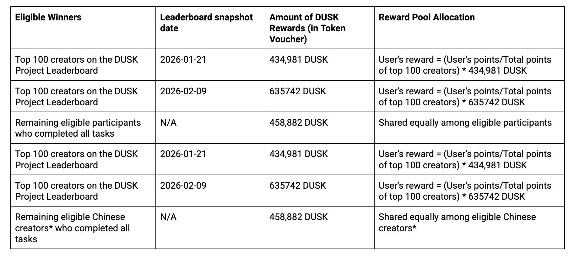 Usuários elegíveis são classificados com base no resultado da tabela de classificação para se qualificar para o pool de recompensas de 3,059,210 DUSK, conforme a tabela abaixo.