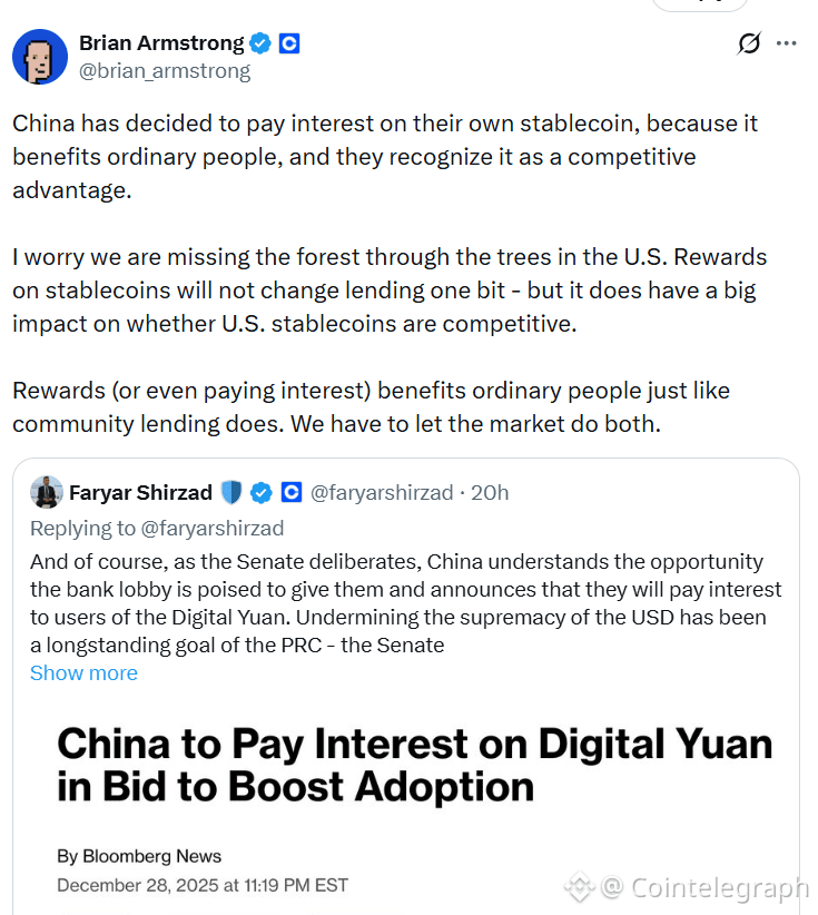 Coinbase CEO Brian Armstrong warned in an X post on Jan. 7 that the decision gives China a “competitive advantage” over US dollar stablecoins and has a “big impact on whether US stablecoins are competitive.”