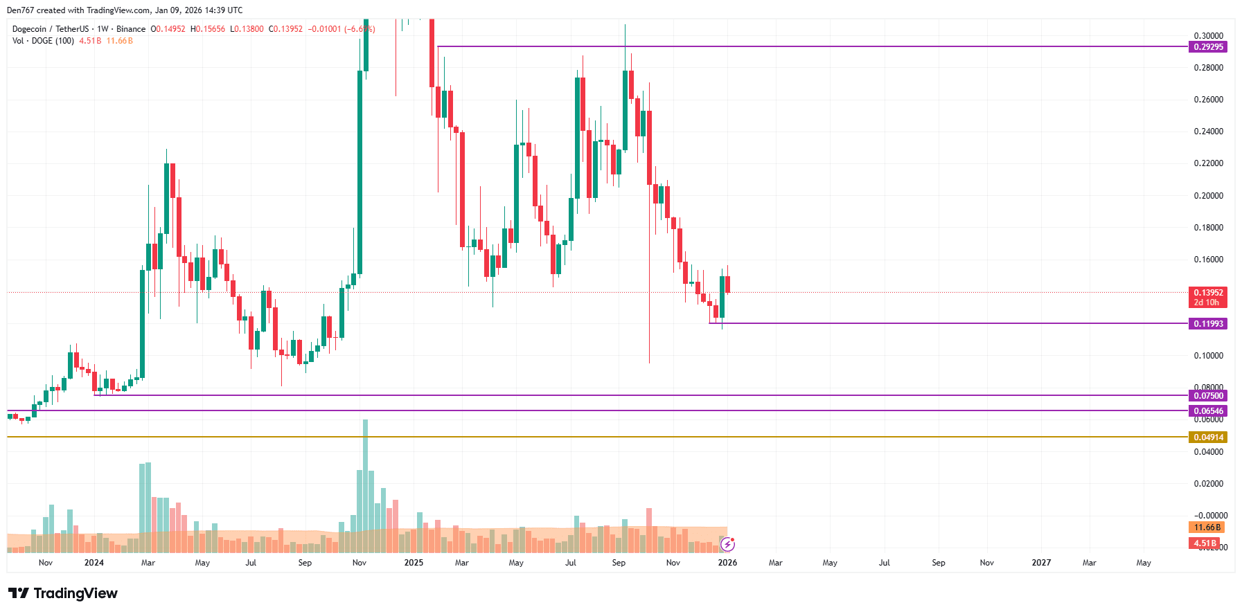 No quadro de tempo mais longo, ainda não há sinais de reversão. O preço do DOGE continua caindo após um falso breakout da resistência em $0,1555.