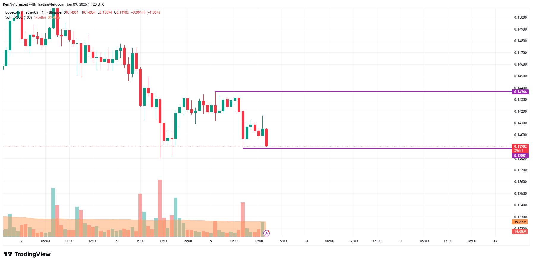 No gráfico horário, a taxa de DOGE está se aproximando do suporte local em $0,1388. Se o breakout ocorrer e a vela diária fechar abaixo desse valor, há uma chance de testar a área de $0,1350 amanhã.