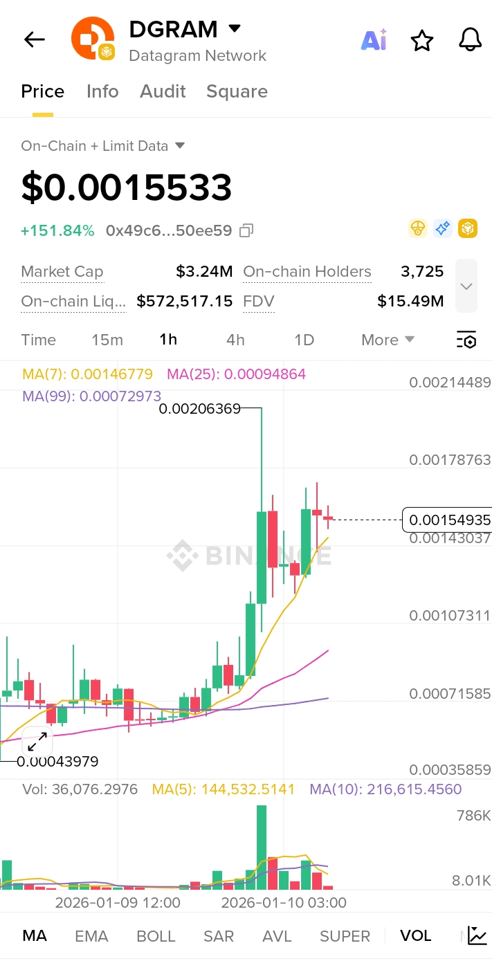 DGRAM está exibindo **forte momentum alcista** após uma quebra de uma consolidação de várias horas. A estrutura sustenta mais alta, mas cautela é recomendada devido a condições de sobrecompra e potencial para realização de lucros de curto prazo.