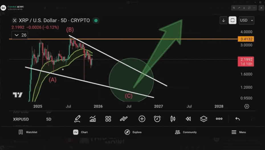 De acordo com a análise do CoinsKid, o XRP tornou-se bearish após perder o nível-chave de suporte de $1,90, o que confirmou uma quebra na estrutura do mercado. Ele acredita que o XRP agora está passando por uma correção macro ABC, com a onda C ainda em andamento.