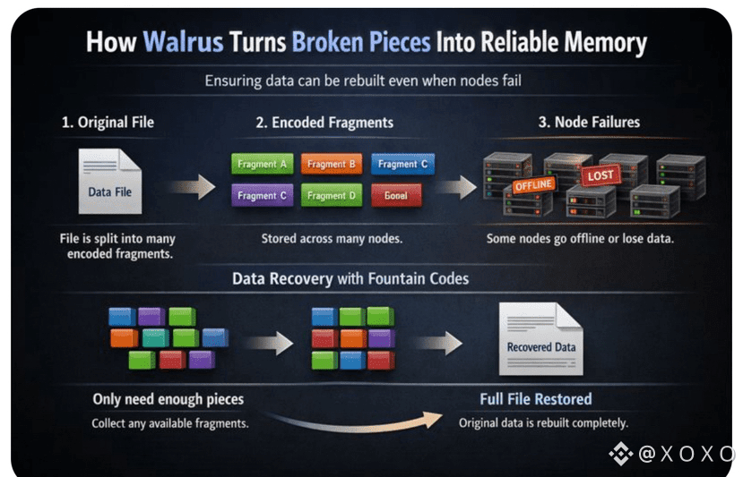 Before talking about fountain codes, it helps to understand the emotional problem they solve. In a decentralized network, no one can promise that a machine will stay online. Operators go away. Data centers close. Incentives change. Even the most honest participant can disappear overnight. If storage depends on machines behaving forever, it will fail. Walrus begins with the opposite assumption. Everything will fail eventually. Therefore recovery must be built into the fabric of the system.