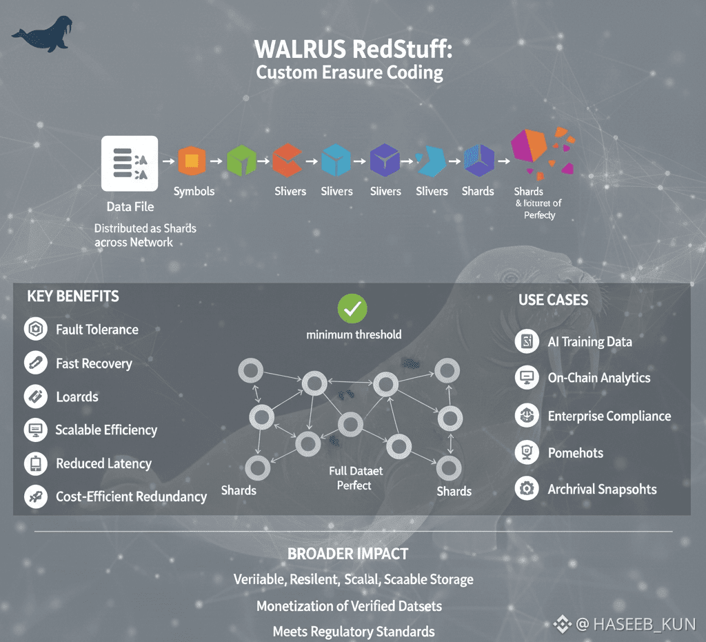 Ultimately, RedStuff is more than a coding innovation—it is the backbone of Walrus’ promise: data that can withstand real-world failure while remaining accessible, auditable, and efficient. By combining mathematical guarantees, fast reconstruction, and scalable architecture, RedStuff transforms decentralized storage from a fragile experiment into production-ready infrastructure. In a Web3 landscape where reliability, transparency, and performance increasingly define value, Walrus demonstrates that decentralized storage can meet institutional-grade expectations while remaining fully trustless and verifiable. Symbol by symbol, shard by shard, RedStuff ensures that the data powering tomorrow’s applications is always safe, available, and ready to drive innovation.
