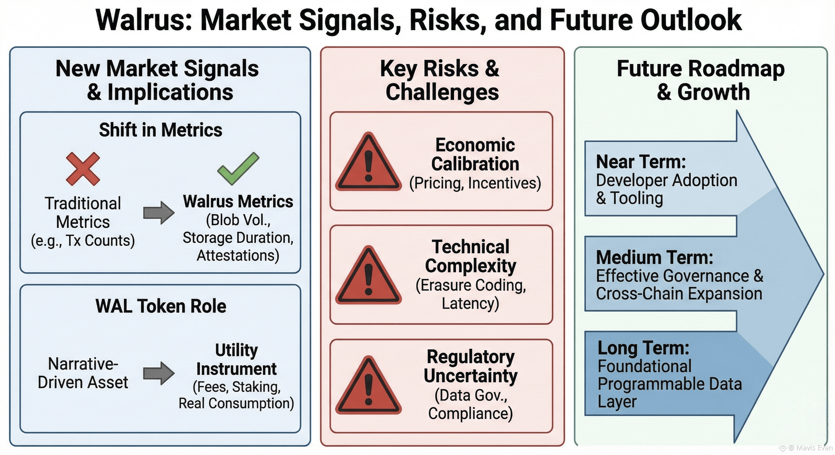 Looking forward, Walrus’s progress will depend on sustained developer adoption, expanding tooling, and demonstrable performance at scale. In the near term, growth in stored data volume and broader application integration will serve as key indicators. Over the medium term, effective governance, refined incentive mechanisms, and potential cross-chain expansion could solidify Walrus’s role as a foundational data layer. If it succeeds, Walrus may reshape how decentralized systems think about storage not as a bottleneck, but as a programmable, verifiable primitive embedded directly into Web3 infrastructure.